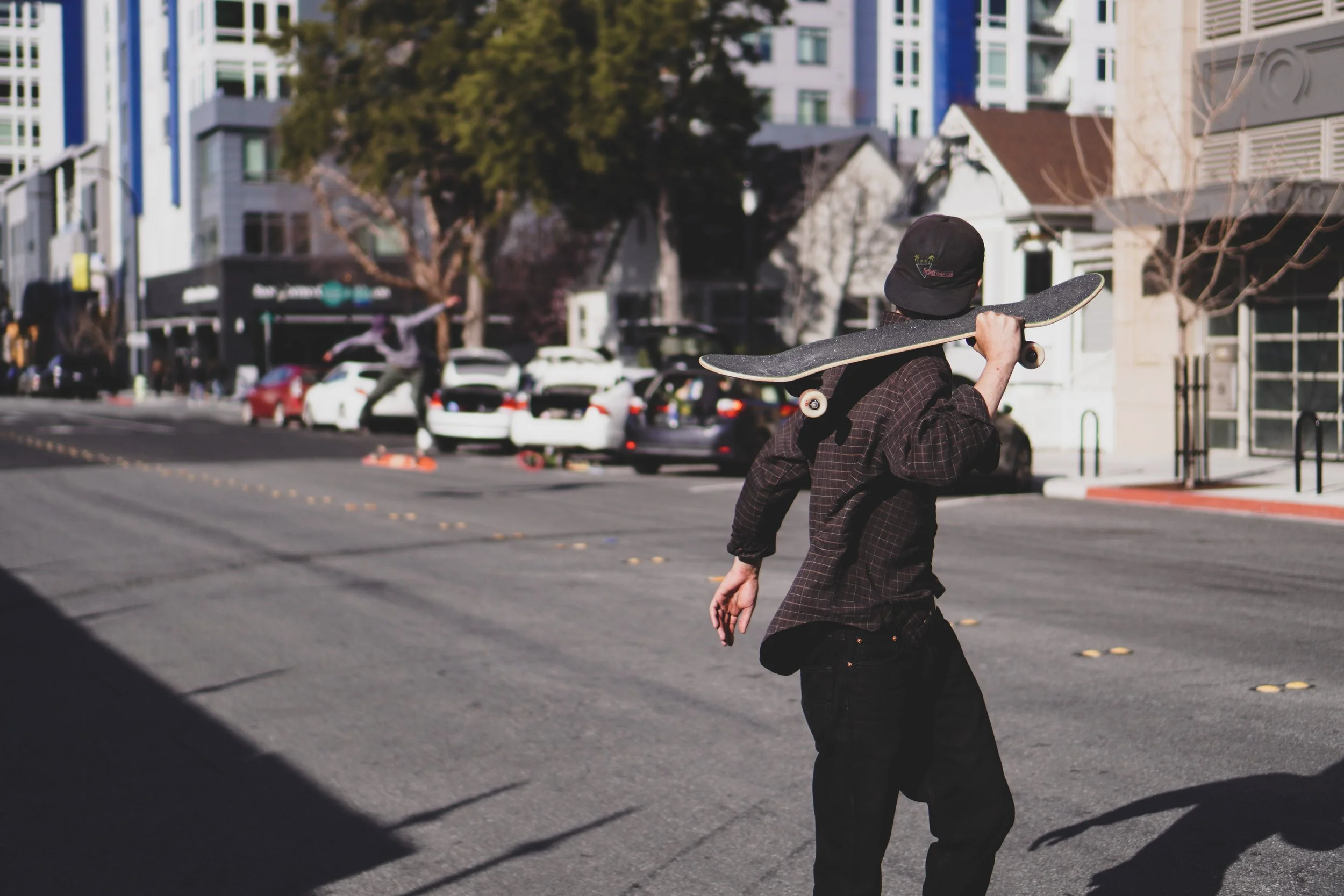 A person wearing a black hat and dark clothing crossing a city street while carrying a skateboard over their shoulder. Several cars are parked along the street and a person in the background is skateboarding. Buildings and trees are visible in the ba