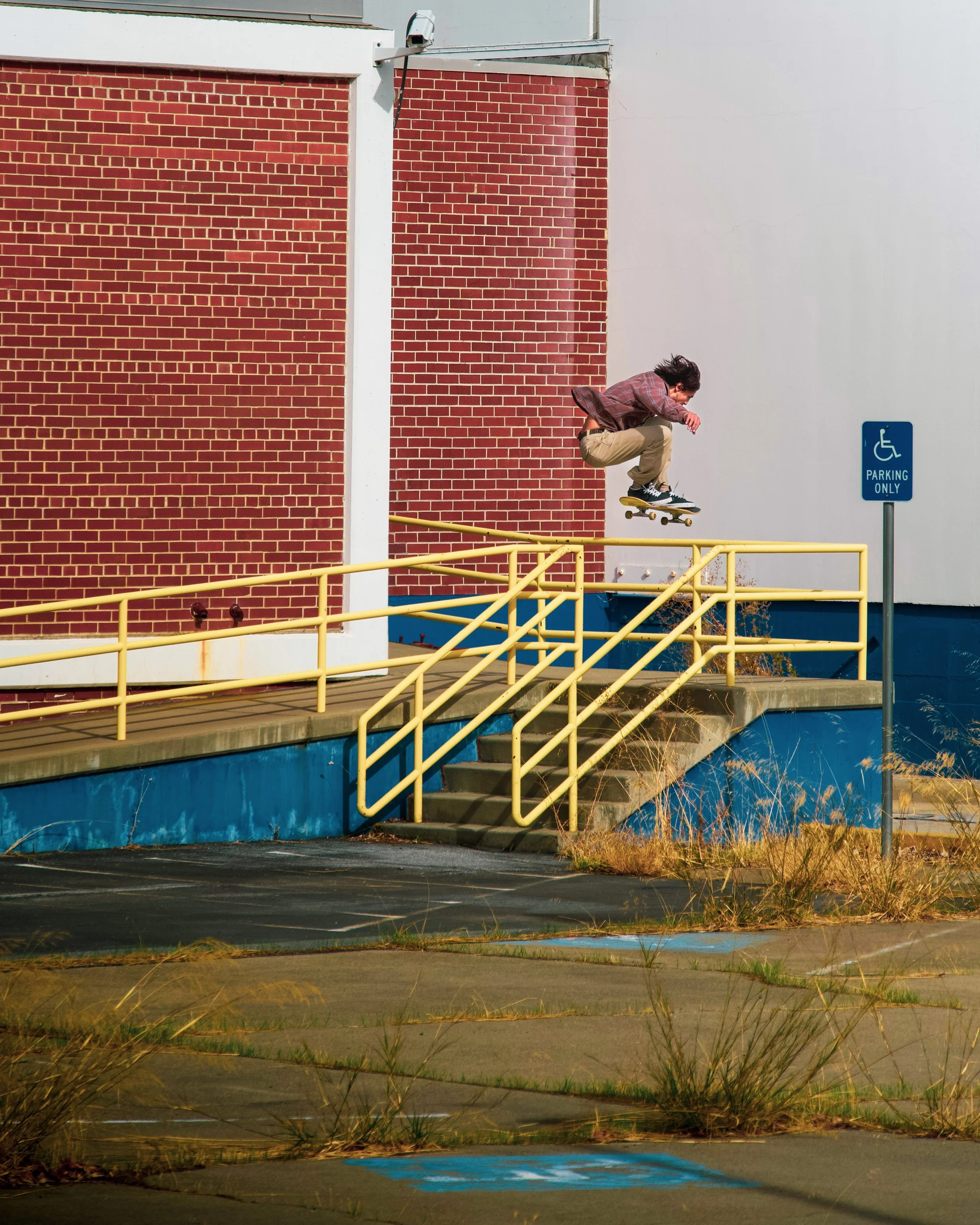 A skateboarder performing a trick off a yellow handrail at an outdoor staircase near a building with red brick and white walls. There is a handicapped parking sign nearby and overgrown grass in the parking lot.