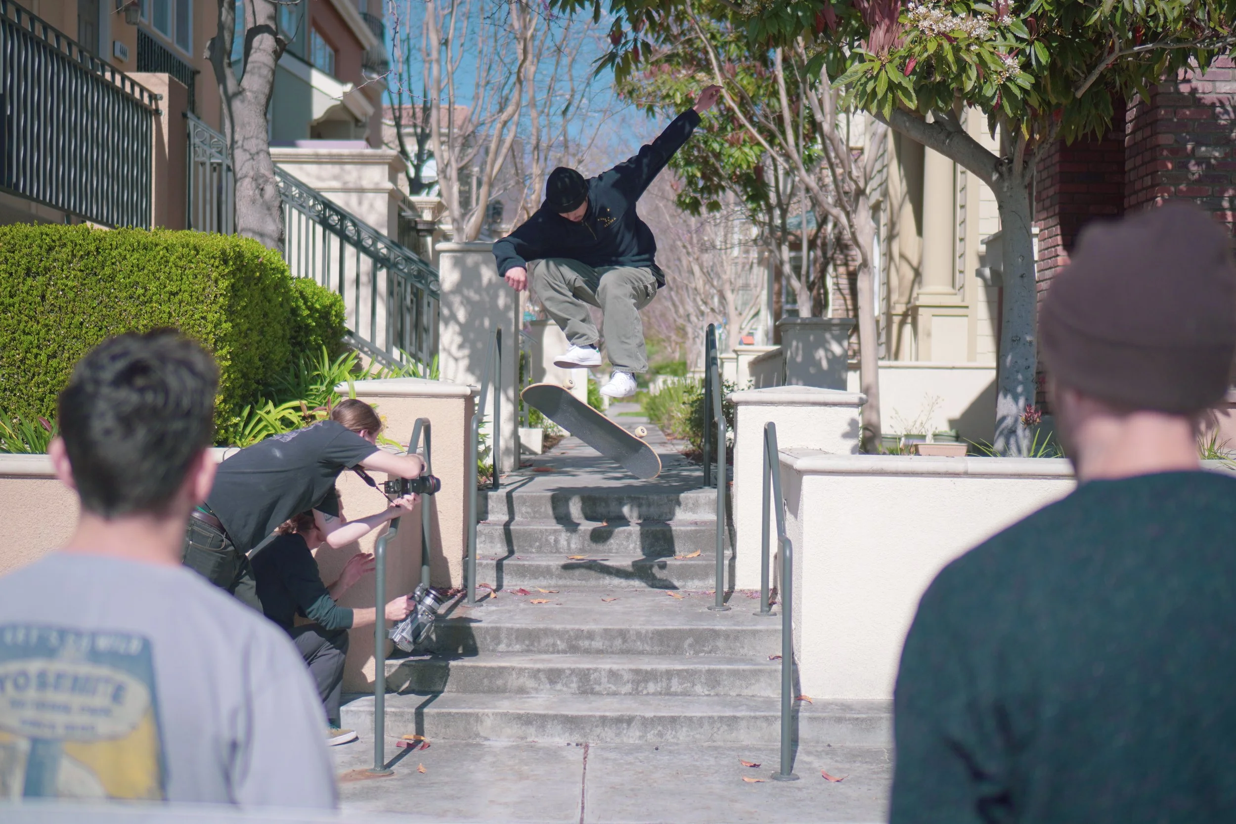Skateboarder performing a trick on stairs, filming crew and two spectators watching, residential neighborhood background.