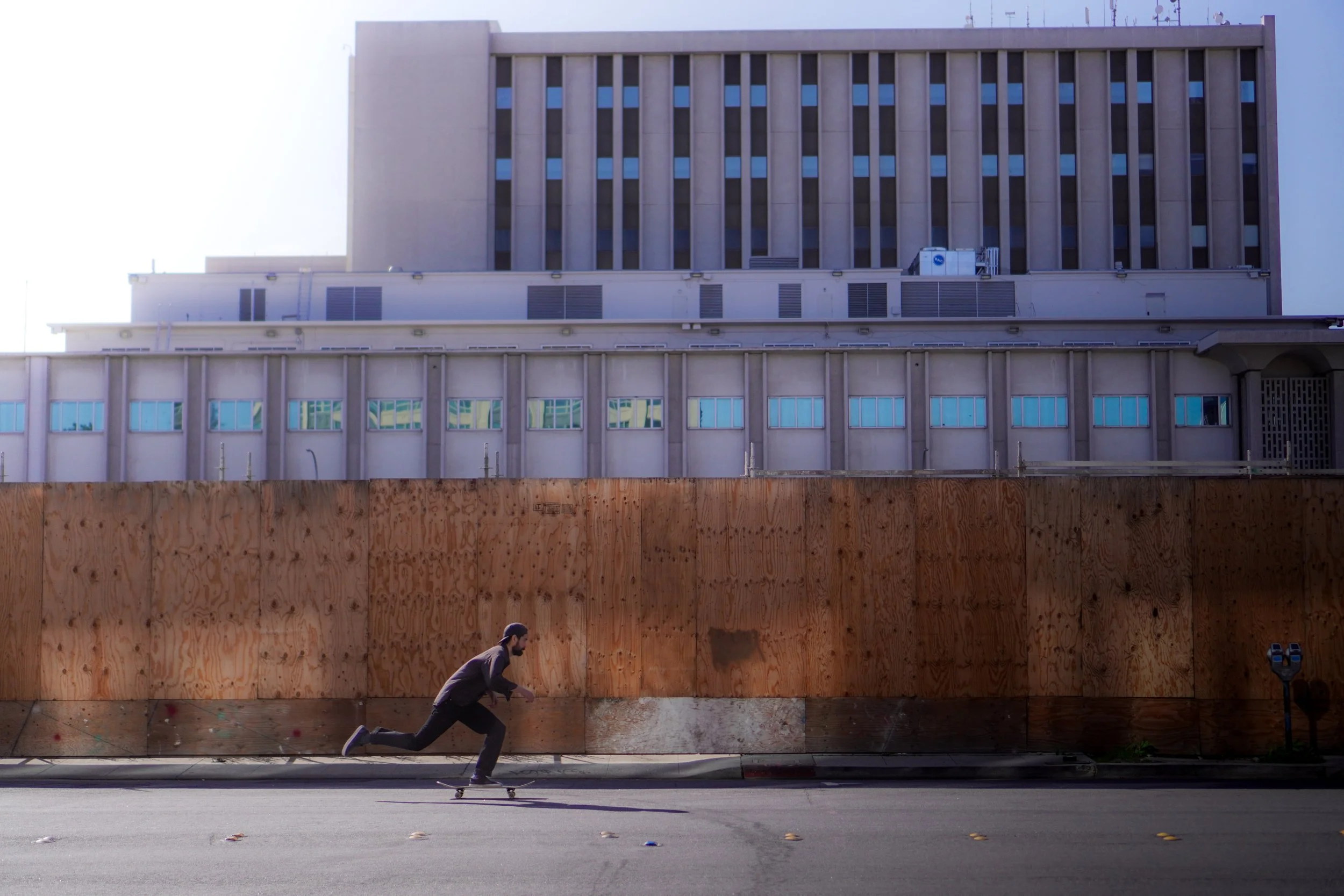 A man skateboarding on a city street in front of a wooden barrier and large building with multiple windows.