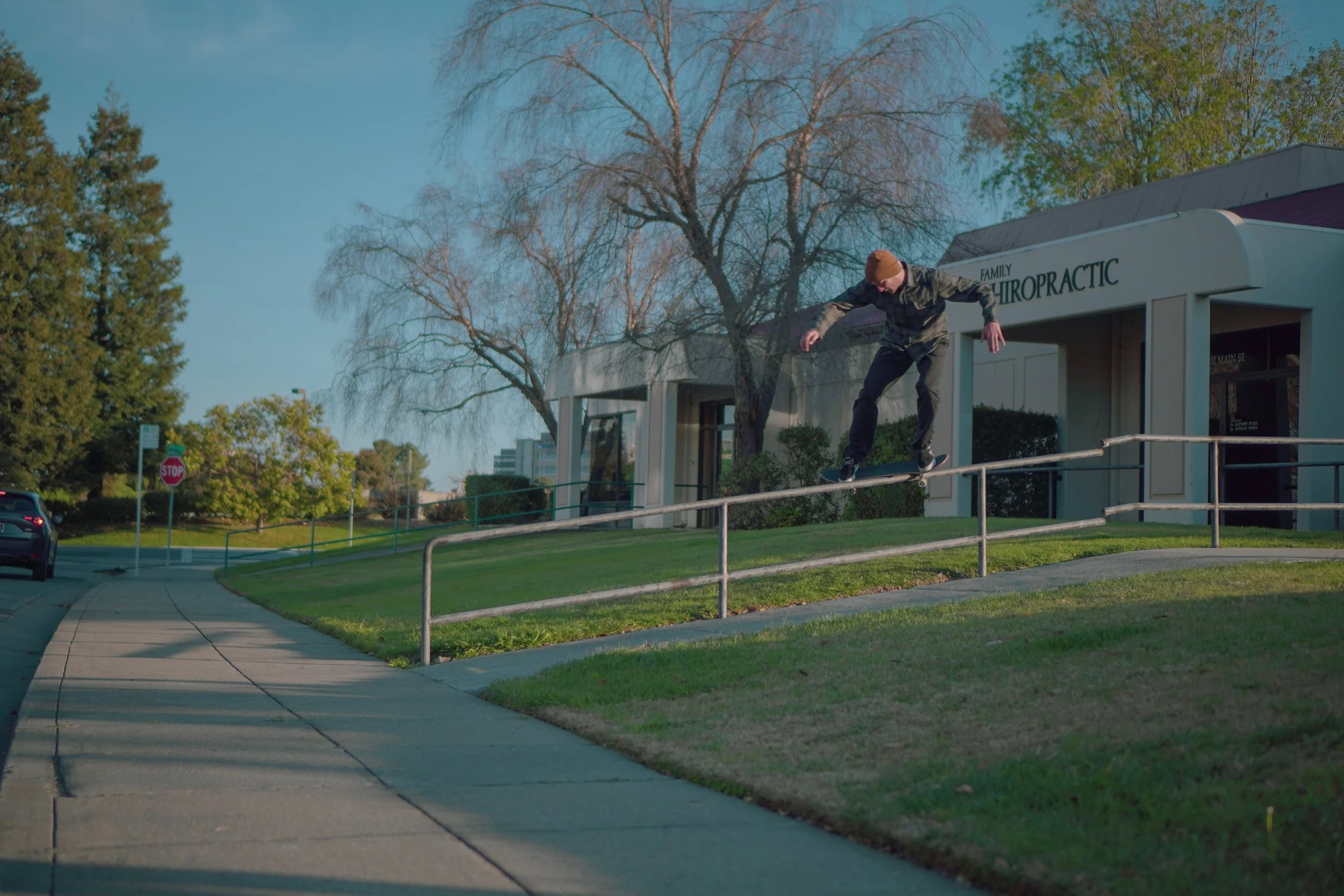 A skateboarder wearing a brown beanie and camouflage jacket performs a trick on a handrail outside a chiropractic clinic on a clear day.