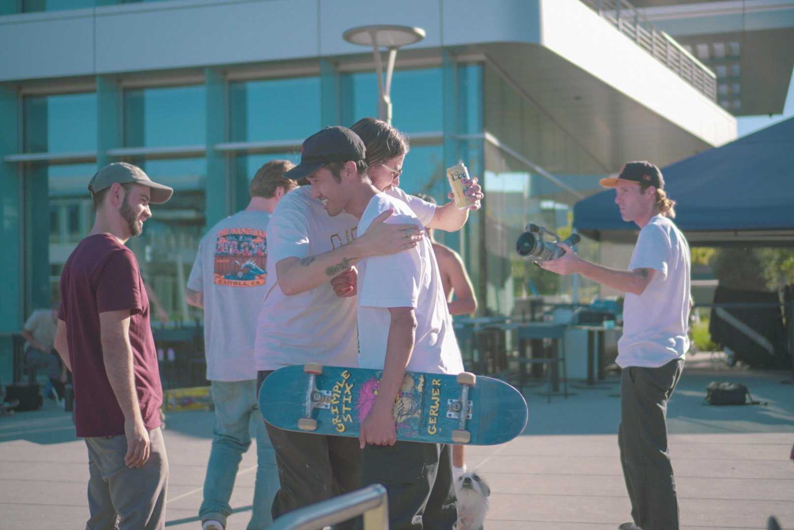 A group of young people outdoors, with two men hugging, one holding a skateboard, while another person records them with a video camera.