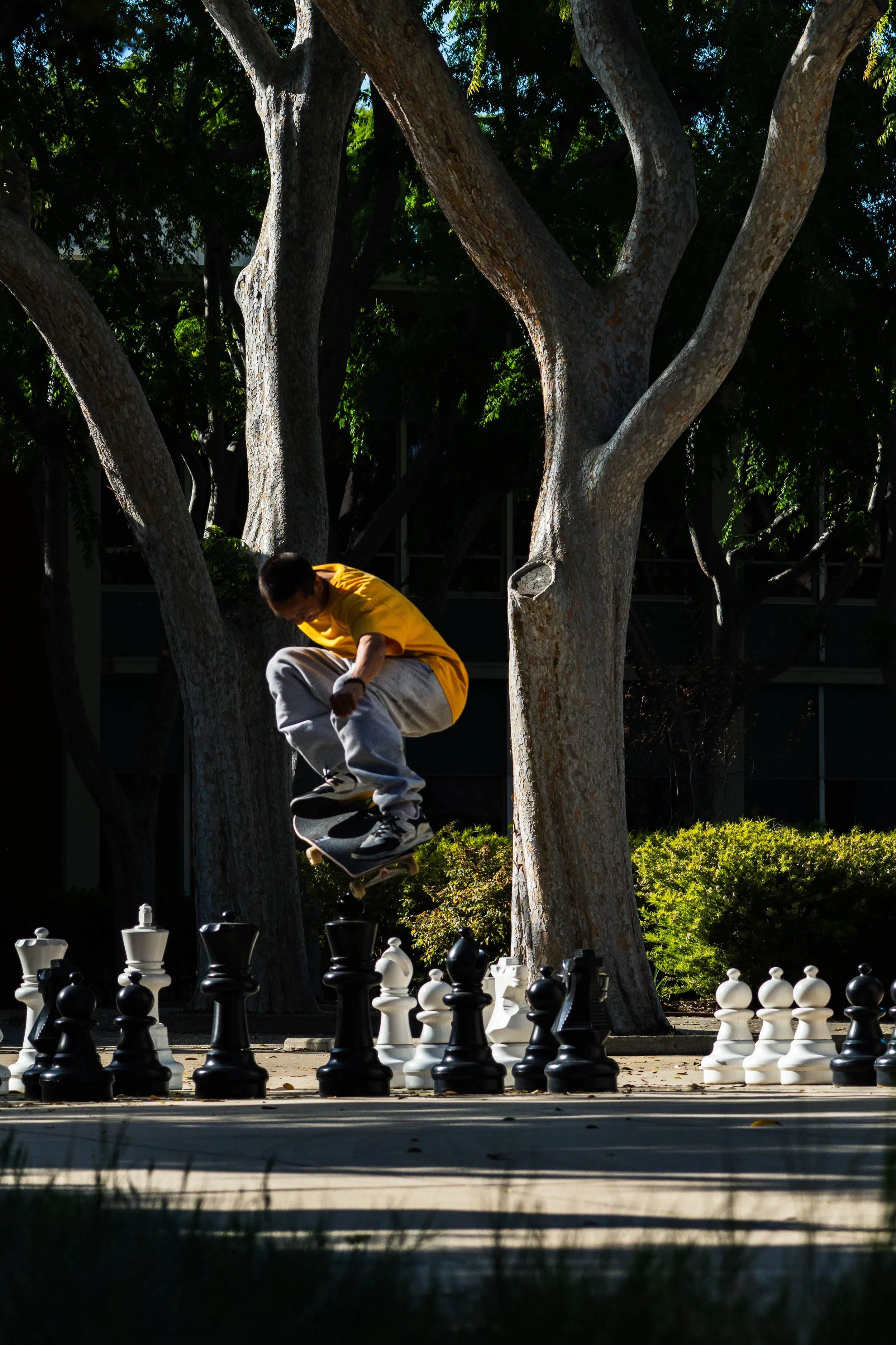 A person skateboarding in a park with large trees and a giant outdoor chess set.