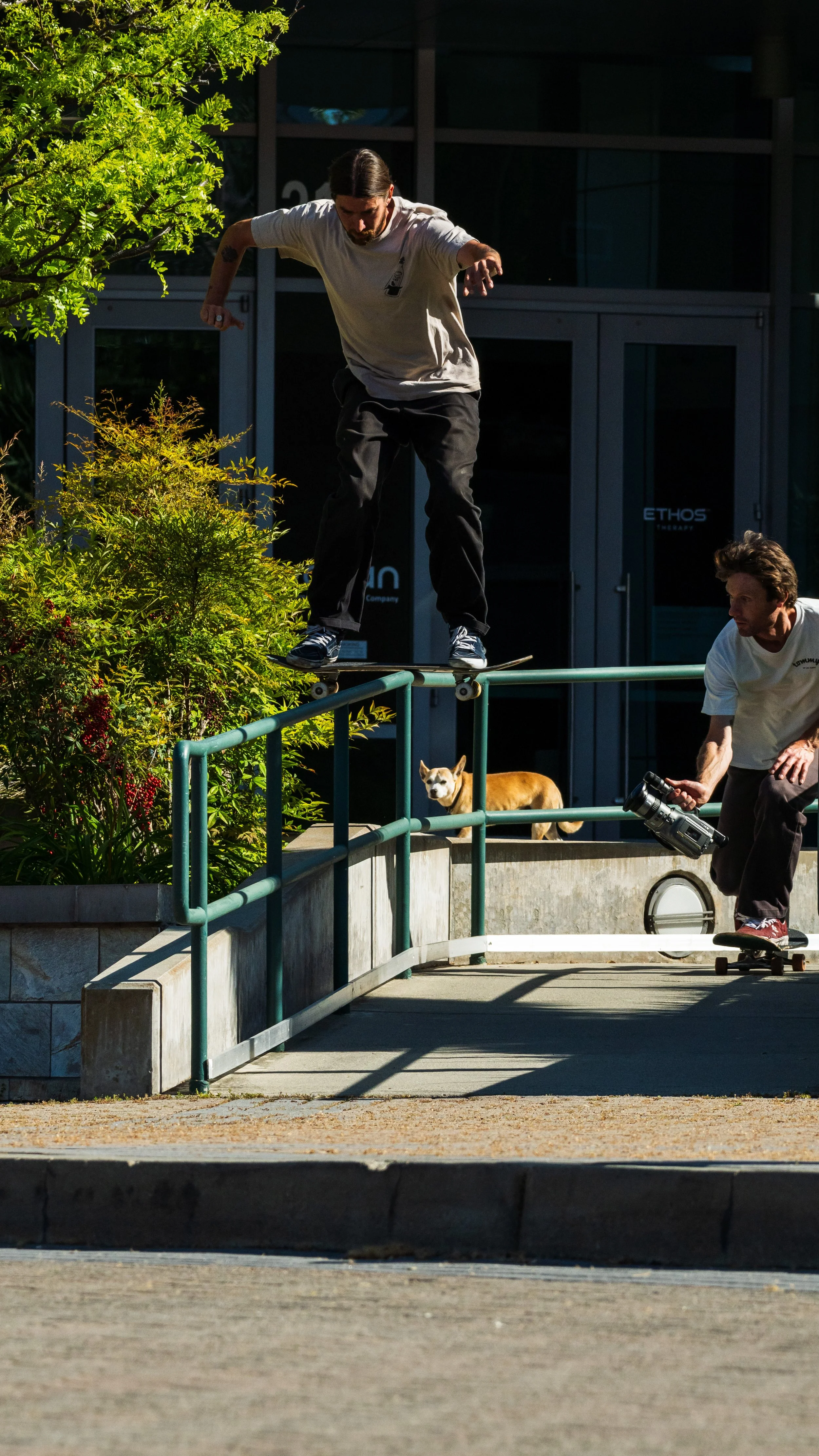 A man skateboarding on a rail with a person filming and a dog watching nearby.